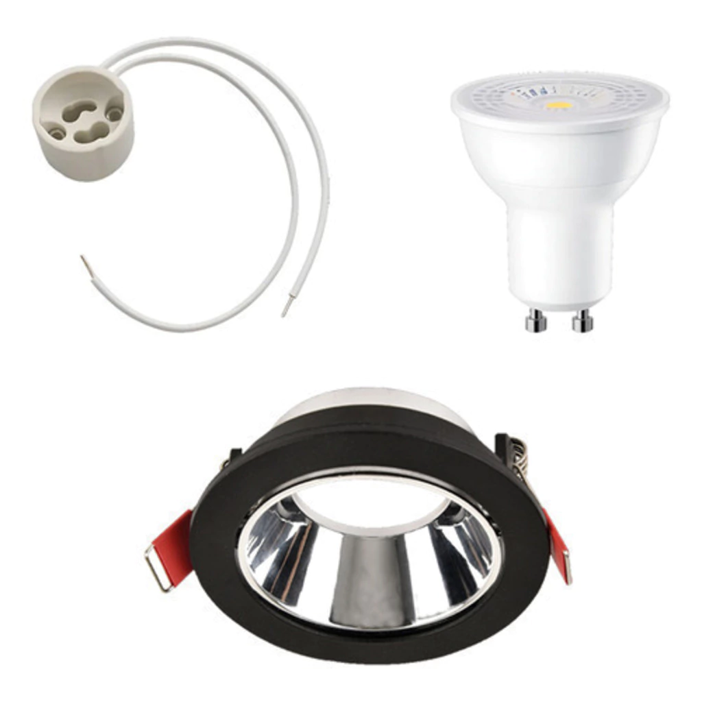 Incluye lámpara LED dicroica tipo PAR16 de luz cálida y zócalo GU10, por lo que viene listo para instalar. El interior en color negro reduce el deslumbramiento directo y mejora el confort visual, brindando una iluminación más profesional.